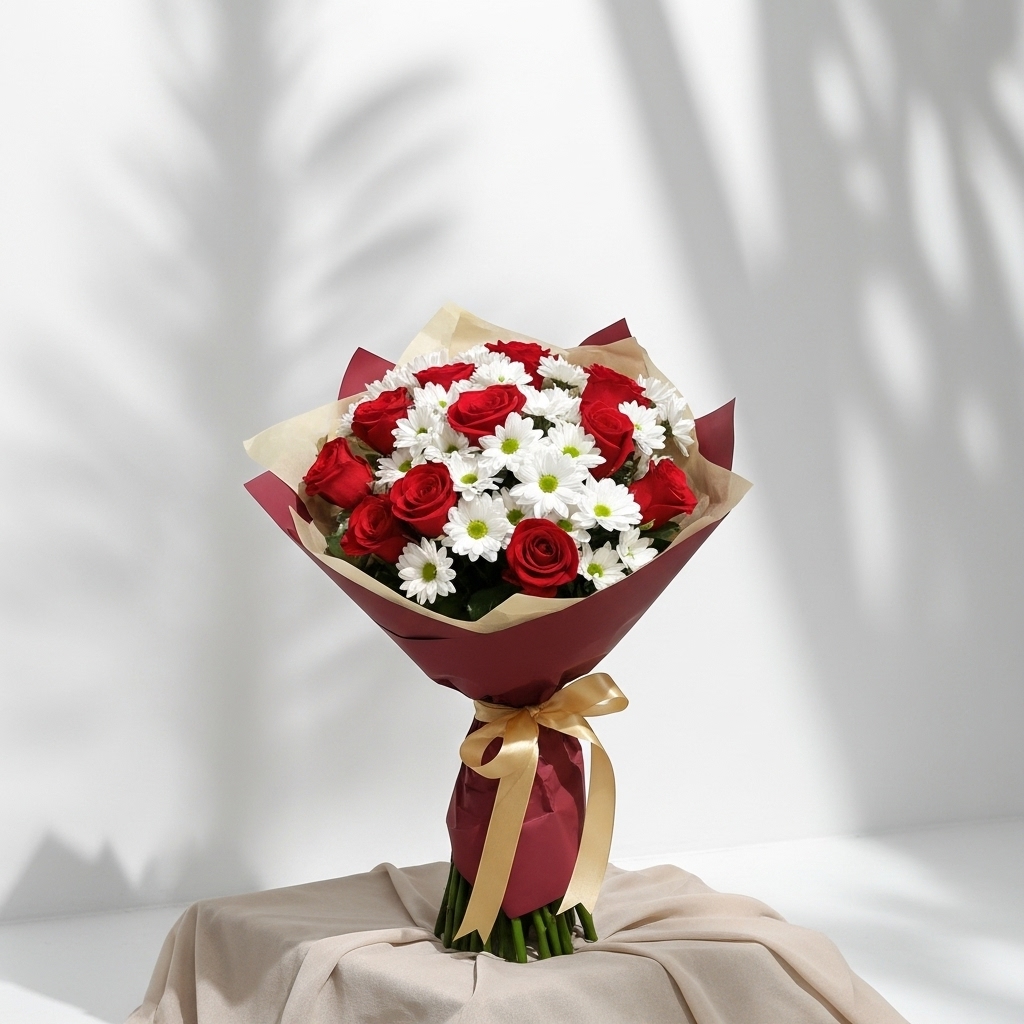 Karışık Beyaz Kırmızı Papatya & Gül Buketi – taze ve özenle hazırlanmış tasarım. Özel günler ve sürprizler için ideal, uygun bölgelerde aynı gün teslim.