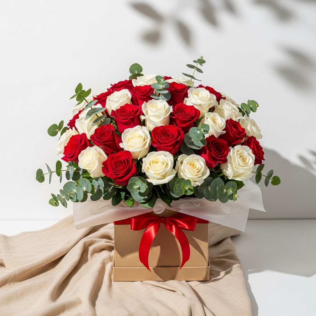 41’Li Karışık Kırmızı Beyaz Gül Kutuda