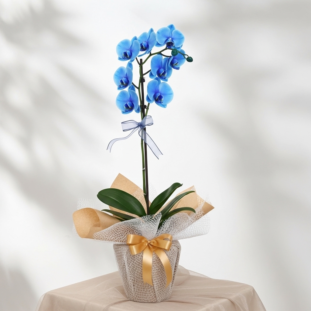 Tek Dal Mavi Orkide Saksıda, özenle seçilmiş orkidelarla hazırlanan şık bir aranjmandır. Dengeli kompozisyonu ve zarif sunumuyla doğum günü, yıldönümü, tebrik, teşekkür ve geçmiş olsun gibi pek çok an için uygundur. Tasarım, sezona göre yeşillik ve yardımcı çiçeklerle tamamlanır. Görseller temsilidir; stok durumuna göre aynı kalite ve tazelikte küçük farklılıklar olabilir. Suyu tazeleyerek ve doğrudan güneşten uzak tutarak uzun süre canlılığını koruyabilirsiniz. Uygun teslimat bölgelerinde aynı gün teslim seçeneği mevcuttur.