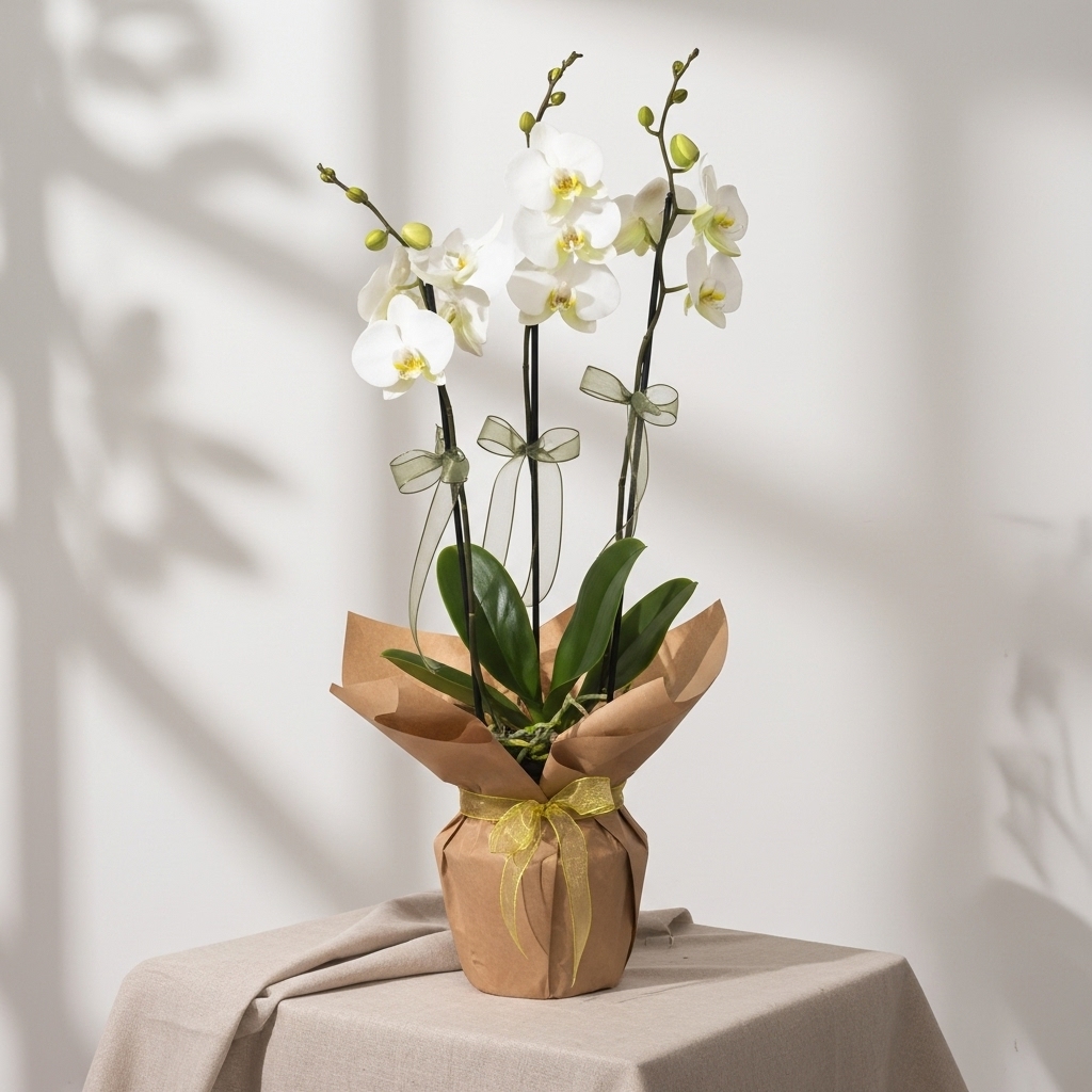 Üç Dal Beyaz Orkide Saksıda, özenle seçilmiş orkidelarla hazırlanan şık bir aranjmandır. Dengeli kompozisyonu ve zarif sunumuyla doğum günü, yıldönümü, tebrik, teşekkür ve geçmiş olsun gibi pek çok an için uygundur. Tasarım, sezona göre yeşillik ve yardımcı çiçeklerle tamamlanır. Görseller temsilidir; stok durumuna göre aynı kalite ve tazelikte küçük farklılıklar olabilir. Suyu tazeleyerek ve doğrudan güneşten uzak tutarak uzun süre canlılığını koruyabilirsiniz. Uygun teslimat bölgelerinde aynı gün teslim seçeneği mevcuttur.