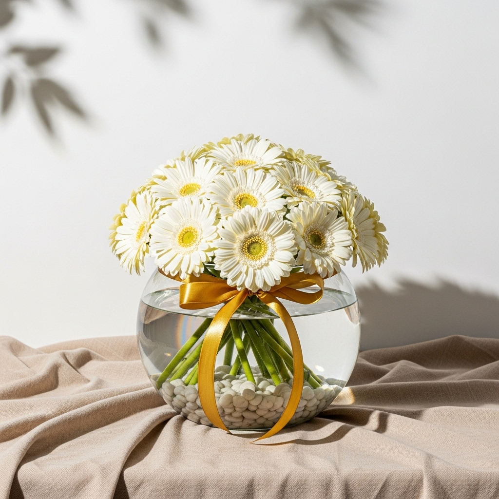 Beyaz Gerbera Vazoda – taze ve özenle hazırlanmış tasarım. Özel günler ve sürprizler için ideal, uygun bölgelerde aynı gün teslim.