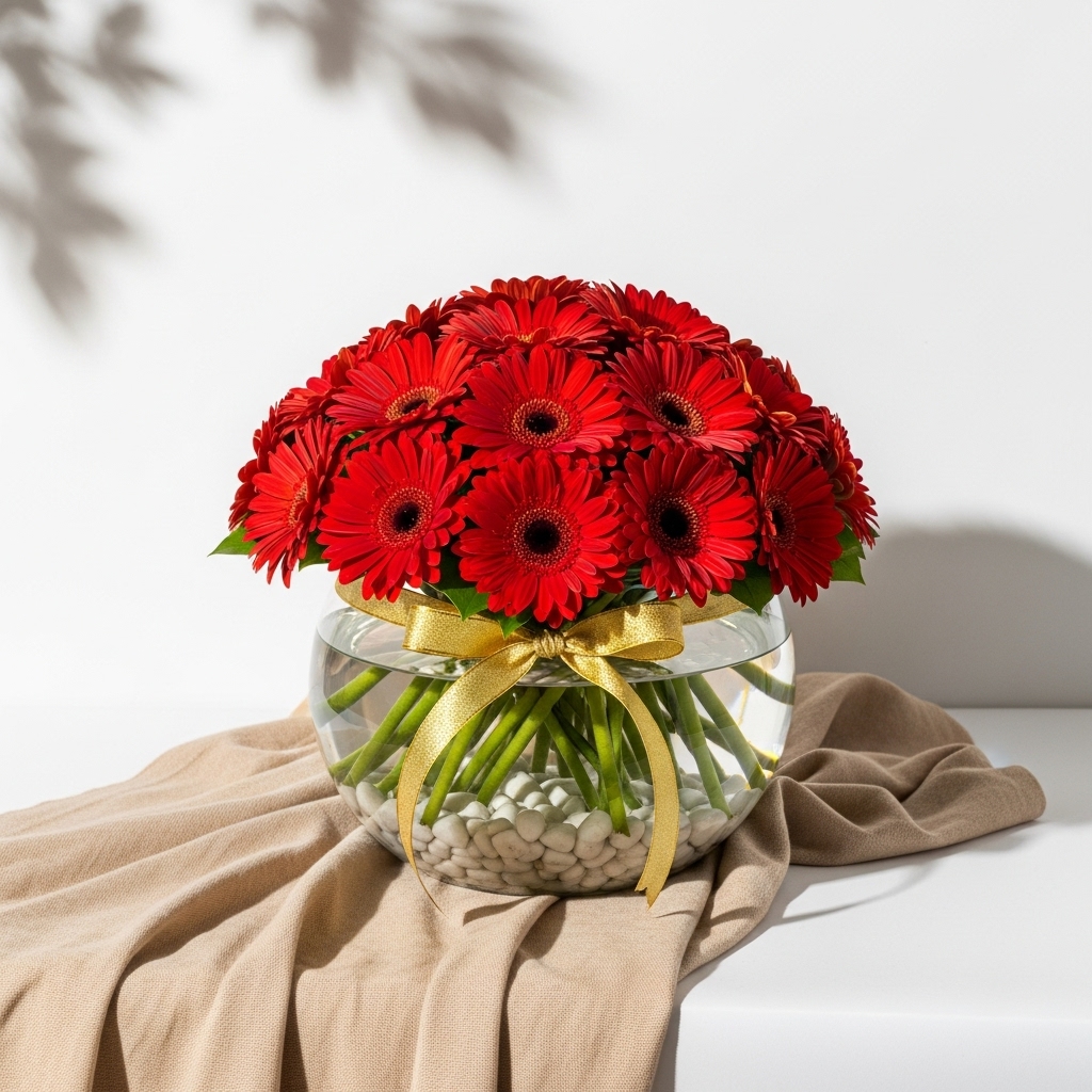 Kırmızı Gerbera Vazoda – taze ve özenle hazırlanmış tasarım. Özel günler ve sürprizler için ideal, uygun bölgelerde aynı gün teslim.