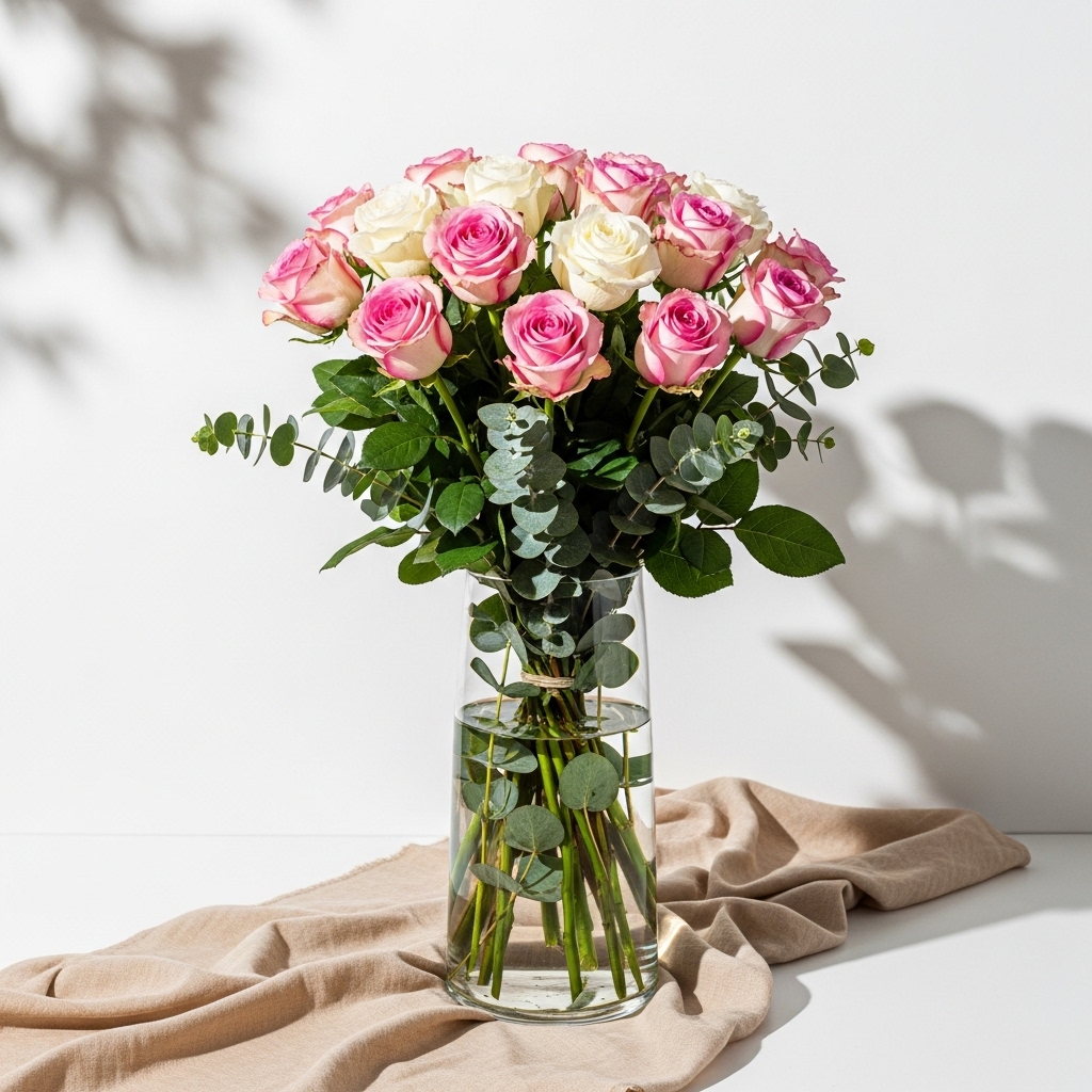 21’Li Karışık Pembe Beyaz Gül Vazoda – taze ve özenle hazırlanmış tasarım. Özel günler ve sürprizler için ideal, uygun bölgelerde aynı gün teslim.