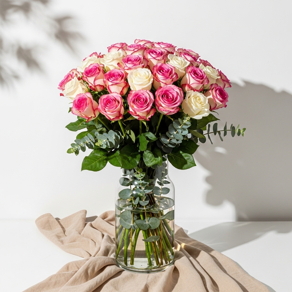 41’Li Karışık Pembe Beyaz Gül Vazoda