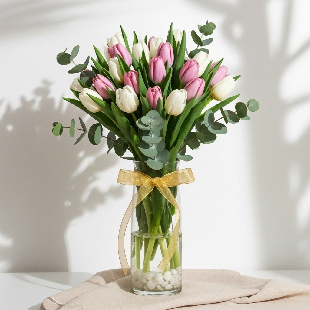 Karışık Pembe Beyaz Lale Vazoda – taze ve özenle hazırlanmış tasarım. Özel günler ve sürprizler için ideal, uygun bölgelerde aynı gün teslim.
