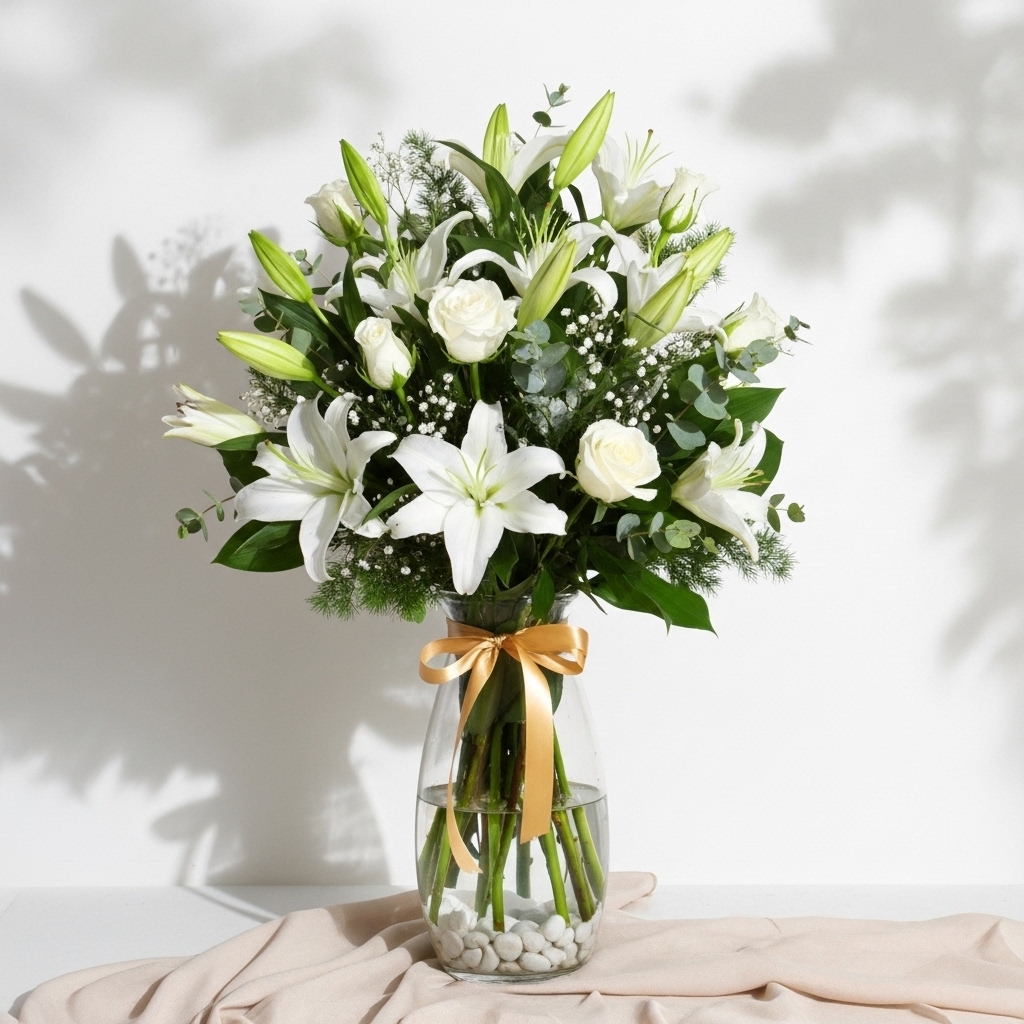 Karışık Beyaz Lilyum & Gül Vazoda – taze ve özenle hazırlanmış tasarım. Özel günler ve sürprizler için ideal, uygun bölgelerde aynı gün teslim.