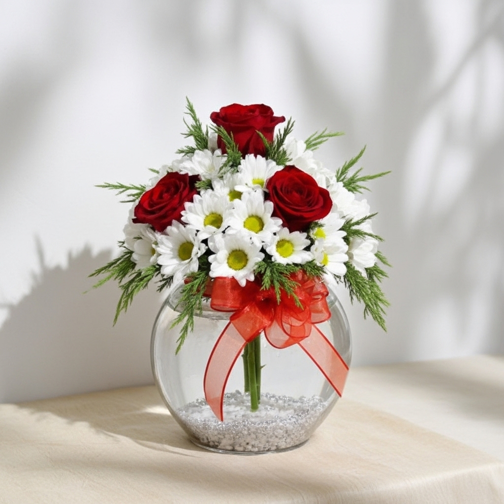 Beyaz Kırmızı Papatya & Gül Vazoda – taze ve özenle hazırlanmış tasarım. Özel günler ve sürprizler için ideal, uygun bölgelerde aynı gün teslim.